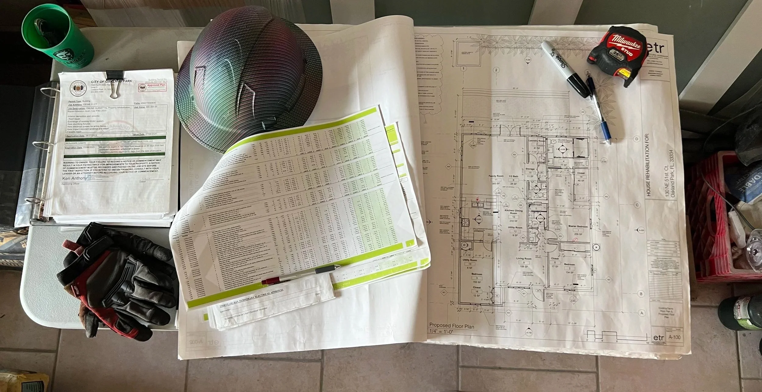 Procurement tracking list for long-lead items (cabinets, windows/doors, tile, appliances, lighting).