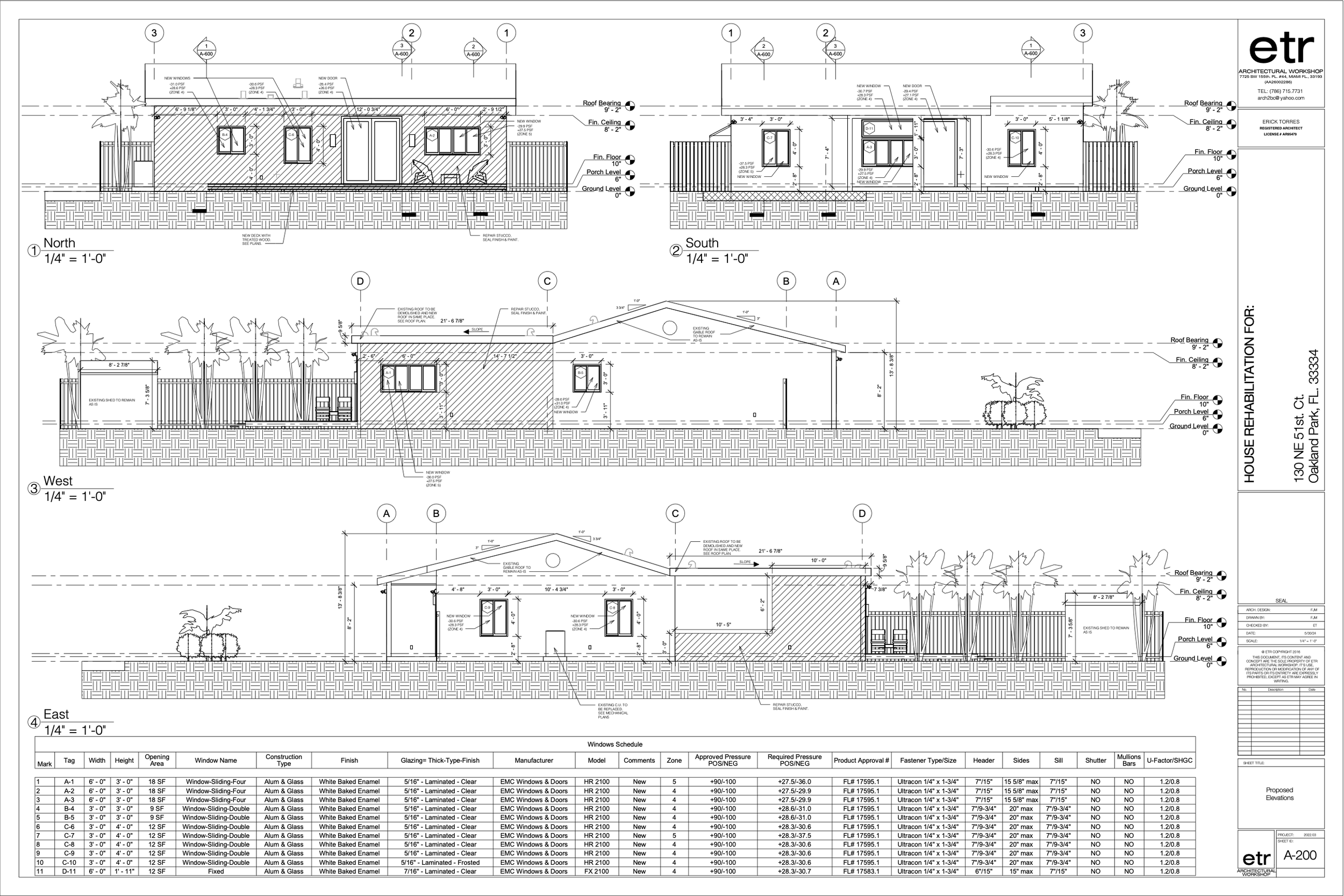 Property measurements and repair indications to the facade. Proposed window upgrades for HZHV impact resistant zone.