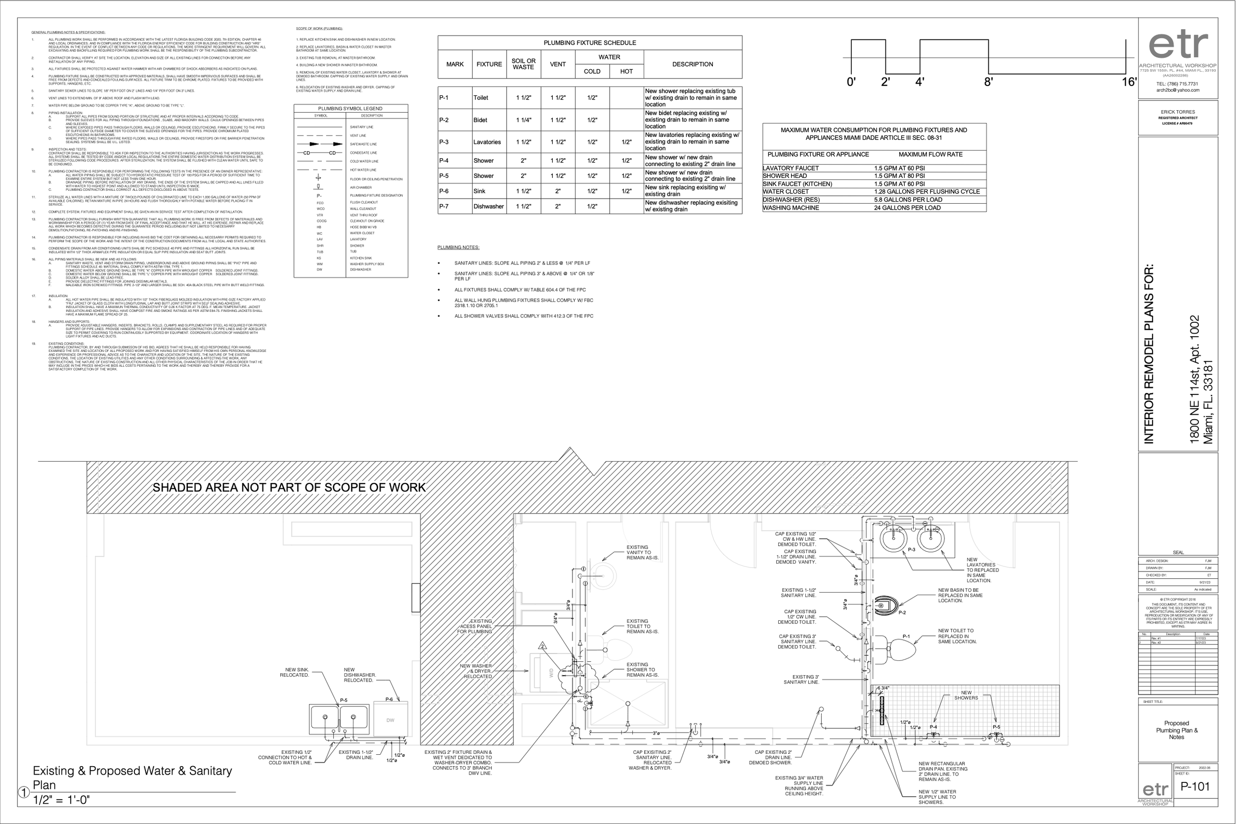 02 Plumbing plan with the integration of new fixtures and existing lines indication. Making sure there is code compliance.