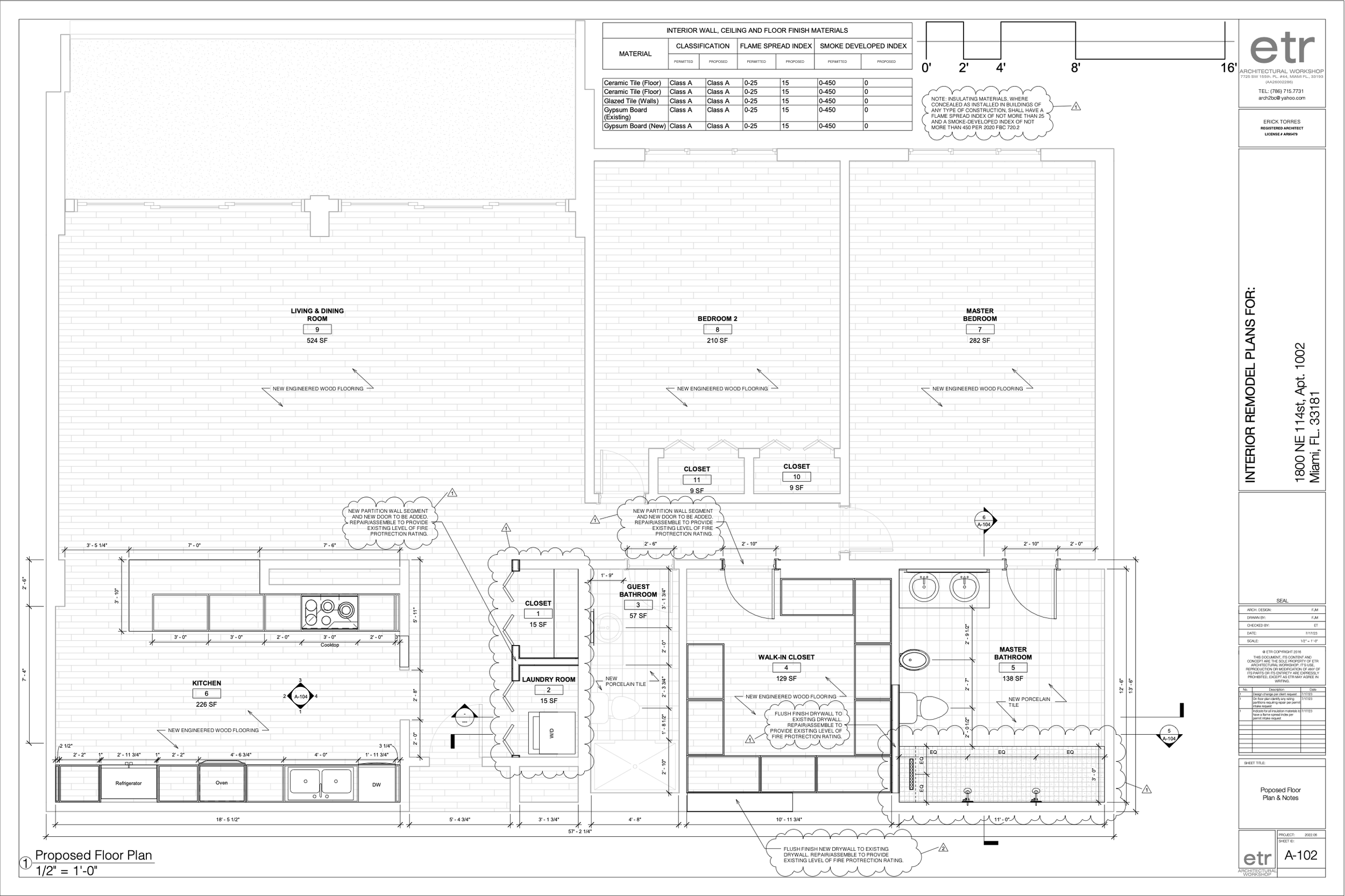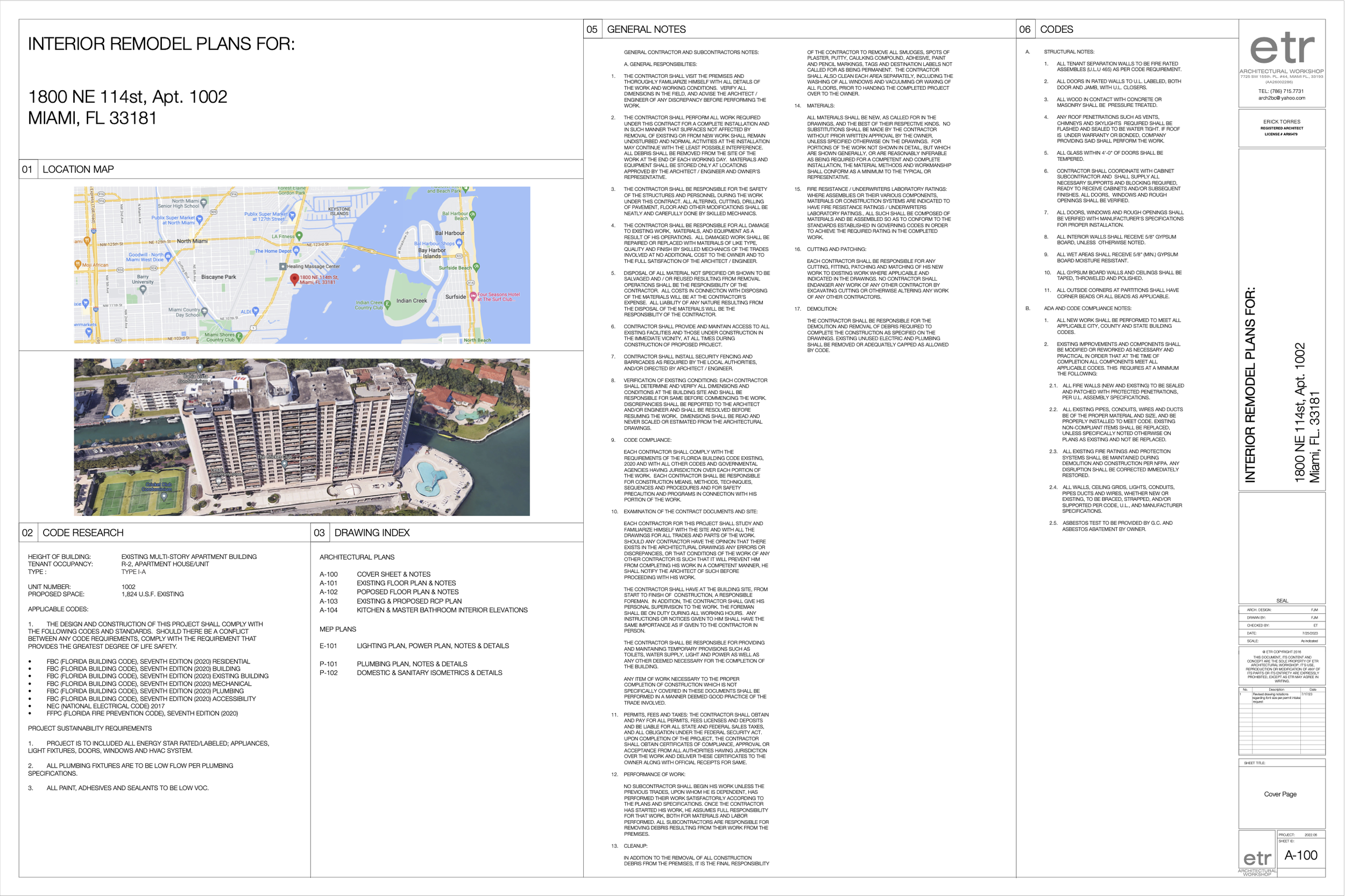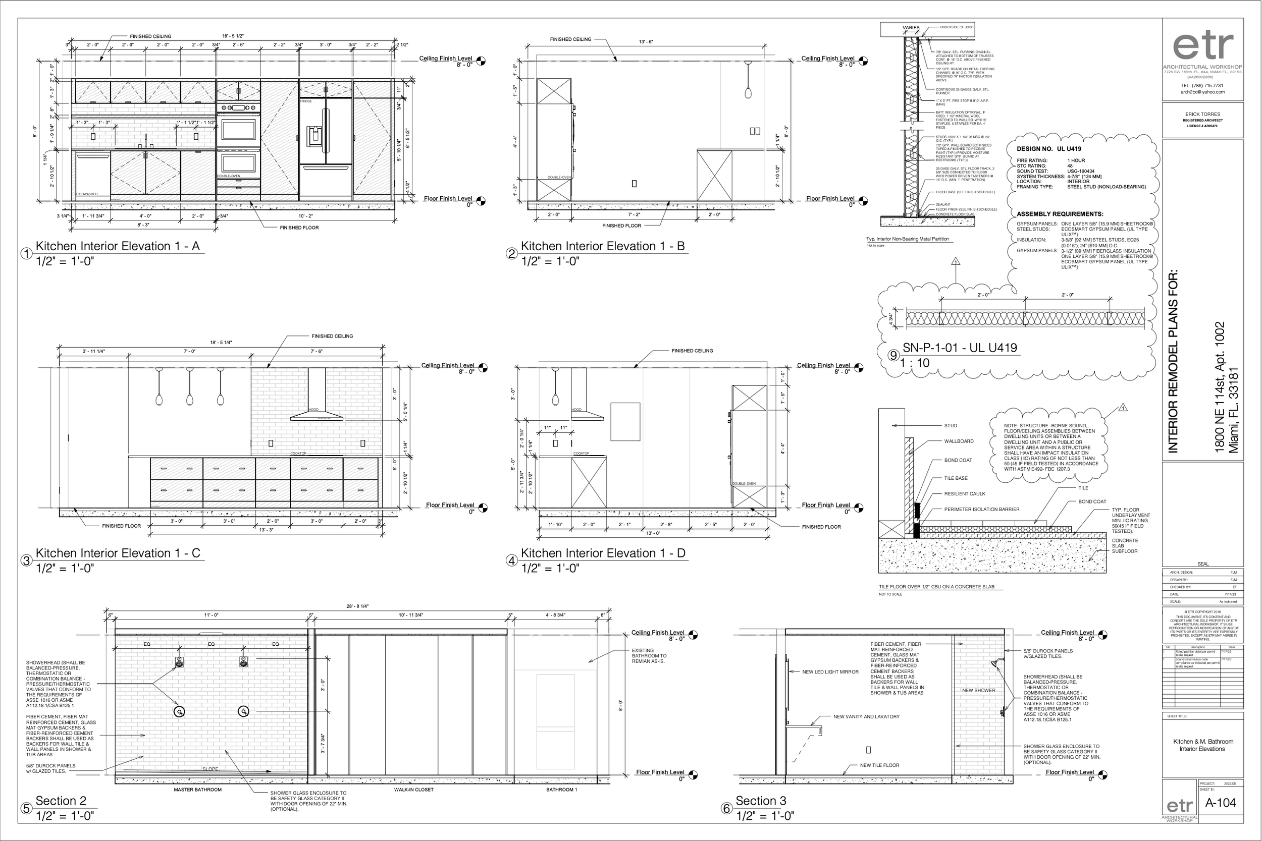 Kitchen drawings: floor plan, cabinetry elevations, key details, and finish schedule.